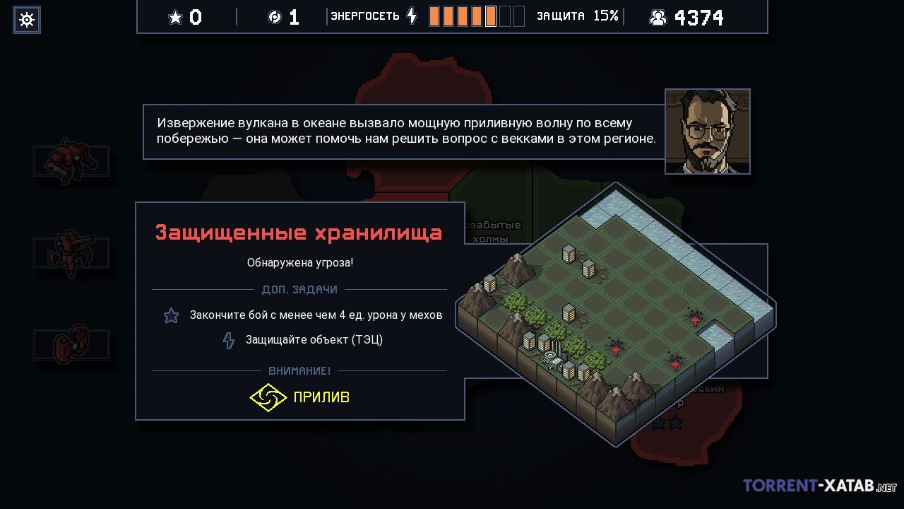 События игры происходят по сюжету в альтернативном будущем, в котором на Землю напали огромные мутанты-насекомые, существа, чем-то напоминающие монстров из «Тихоокеанского рубежа». Теперь мир в опасности, и человечество было вынуждено прибегнуть к своей самой передовой разработке – огромным мехам, вооруженным до зубов самым современным вооружением. Ну а вам же теперь, если решитесь скачать Into the Breach торрент у нас бесплатно и начнете прохождение игры, придется взять под контроль отряд таких мехов и отправиться в череду опаснейших миссий. И не думайте, что миссии будут легкими. На самом деле каждая новая миссия станет для вас самым настоящим испытанием.